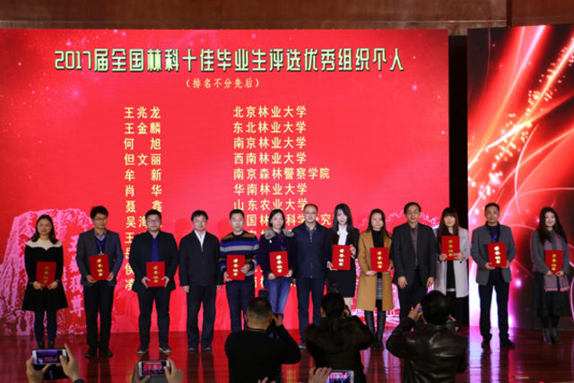 On December 20, the 2017 National Forestry Discipline Top Ten Award Ceremony was held at Shandong Agricultural University. Lian Bolin, Ph.D. candidate of the Forest Plant Ecology Laboratory, a Key Laboratory of the Ministry of Education, won the honor of “National Forestry Discipline Top Ten Graduate (Graduate Group)”; Ha Hongzhu from the College of Landscape Architecture won the same honor for the undergraduate group; Wei Xin and 10 other students won the honor of “the National Forestry Discipline Outstanding Graduates”; Wang Jinlin, director of Employment Office of the Graduate School, won the “Outstanding Organization Individual Award.” Peng Yuandong, deputy director of the State Forestry Administration, and Hao Yujun, deputy director of the Personnel Department of the State Forestry Administration, presented trophies and certificates to Lian Bolin and Ha Hongzhu.