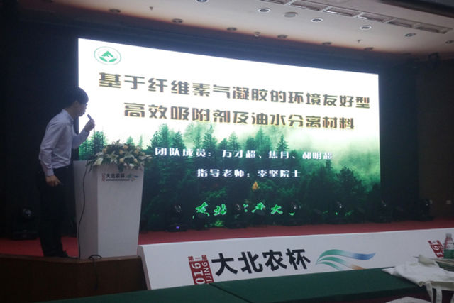 Our school attached great importance to the contest and was careful and elaborate in the selection, recommendation, guidance and the optimization of the works. Under the guidance of academician Li Jian, the work by Wan Caichao and other students focused on the preparation of cellulose aerogels based on agriculture and forestry biomass resources as raw materials, and built new aerogel adsorption material through means such as physical and chemical modification, doping, and pyrolysis, in order to process polluting water such as oily wastewater, dye wastewater, heavy metal ion wastewater. The work won unanimous praise from the experts for its perspective and preciseness.