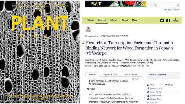 In March 2019, the 31st issue of Plant Cell published a research paper entitled "Hierarchical Transcription Factor and Chromatin Binding Network for Wood Formation in Populus trichocarpa". The study provides a new and accurate approach to genetic improvement for improving forest productivity, and the paper was selected as the cover article for the month.