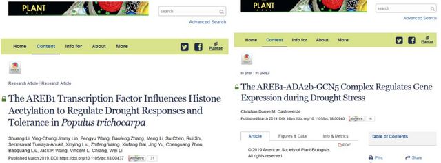 In the same issue, Plant Cell published a research paper entitled "The AREB1 Transcription Factor Influences Histone Acetylation to Regulate Drought Responses and Tolerance in Populus trichocarpa". This study reveals that transcription factor and histone modifications synergisticallyregulate the new mechanism of populus trichocarpa adaptation to drought stress, and open up new ideas for the use of molecular techniques for forest resilience breeding. This research was reviewed by a special paper written by Plant Cell, which provides a new insight into the role of epigenetic regulation in plant response to drought stress.(Castroverde 2019, Plant Cell, 31: 559-560)