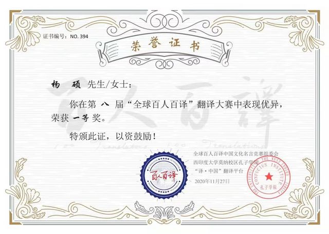 The competitionwas jointly organized by theGlobalGroup Committee of the "100Translators,100Translations" ChineseCulturalSayingsCompetition and the Confucius Institute atthe Mona Campus of the University ofthe West Indies, who awarded the certificates together.The standard of thisChinese -English translation competition isfaithfulness, expressiveness, elegance and personal preference of the reviewers. The ranking of the competition isbased onthe votes of 6 native English speakers and 4 Chinese judges whose votes are rated as Excellent, Very Good and Good respectively. The first, second and third prizes are determined according to the number of votes won. The participants of this eventwere from nearly 100 well-known institutions of higher learning in the world, including Beijing Foreign Studies University,School ofForeignLanguages of Beijing Institute of Technology at Zhuhai, Dalian Jiaotong University, Beijing Jiaotong University, Shanghai Jiaotong University, Leeds University and UC Santa Barbara.A total of eight first prizes were awarded, among which Yang Shuo waslisted.
