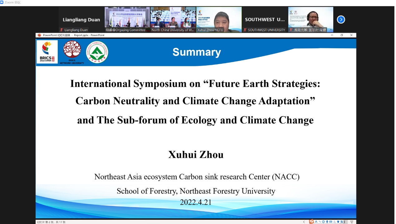 On April 21st, after the sub-forum was finished, Professor Zhou Xuhui gave a summary report at the main venue of the 2022 BRICS Network University Annual Meeting. Professor Zhou said that the sub-forum on ecology and climate change has carried out 12 categories of reports themed by "Countermeasures for future Earth: Carbon Neutralization and Climate Change Response", with more than 100 people participating in the sub-forum and having lively discussions. The successful convening of the sub-forum on ecological climate change not only provides valuable communication opportunities for experts and scholars from member units of BRICS Network University, but also provides a new way for cooperation and communication on the theme of carbon neutrality and climate change.