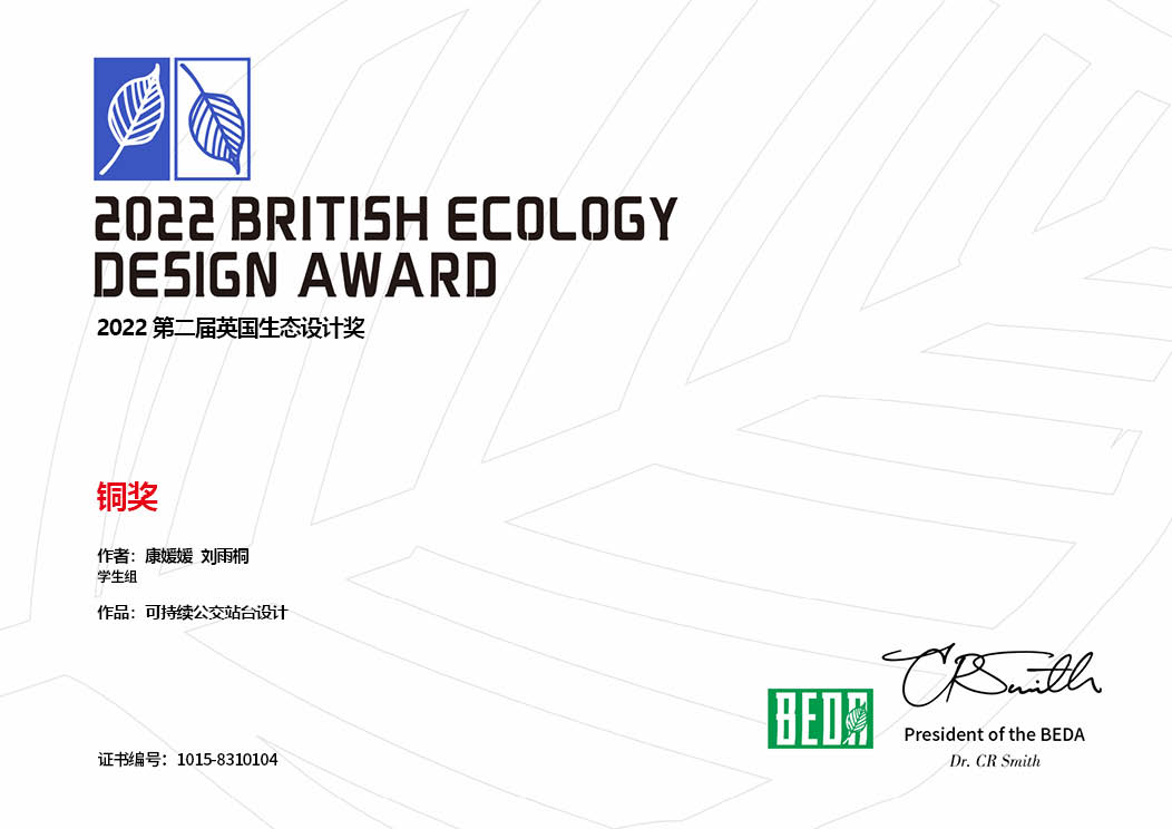 Recently, the results of the 5th British Ecology Design Awards, 2022, directed by the UK Department of the Environment, organized by the British Ecology Design Association, and hosted by AMC Environmental Research were announced. The works “Sustainable Bus Stop Design”, “Animal Records” and “Lingzhi Chair” submitted by the team of industrial design students Kang Yuanyuan, Liu Yutong, Liu Zhi Ao and Zhang Tong from the School of Mechanical and Electrical Engineering and Song Zhuoyu from the School of Wildlife and Nature Conservation won three bronze awards.