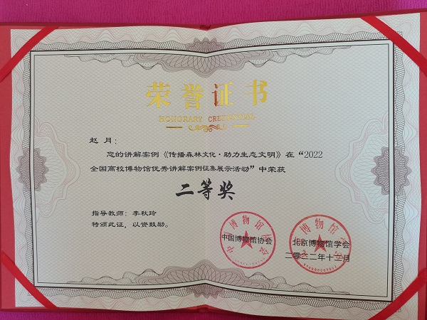 Recently, with the approval of the National Cultural Heritage Administration, the 2022 National University Museum Display Explanation competition, sponsored by the Chinese Museum Association and Beijing Society of Museums, undertaken by the Professional Committee of College Museums and the Professional Committee of New Media and Communication in Beijing Society of Museums, and co-organized by the Media Museum of Communication University of China and People’s Cultural Museum, was successfully held. Zhao Yue, a lecturer at the China (Harbin) Forest Museum, won the second prize.