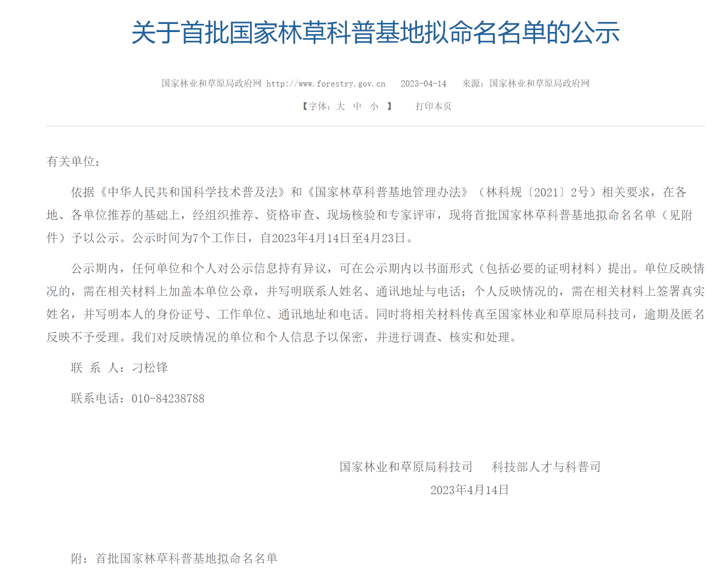 In October 2021, the Office of the National Forestry and Grassland Administration and the General Office of the Ministry of Science and Technology issued the Notice on the Application and Identification of the First Batch of National Forest and Grassland Science Bases. The university attached great importance to it, and the museum actively prepared materials for application. After qualification examination and on-site verification conducted by experts in July 2022, the museum entered the proposed list of the first batch of national forest and grassland science bases on April 14, 2023.
