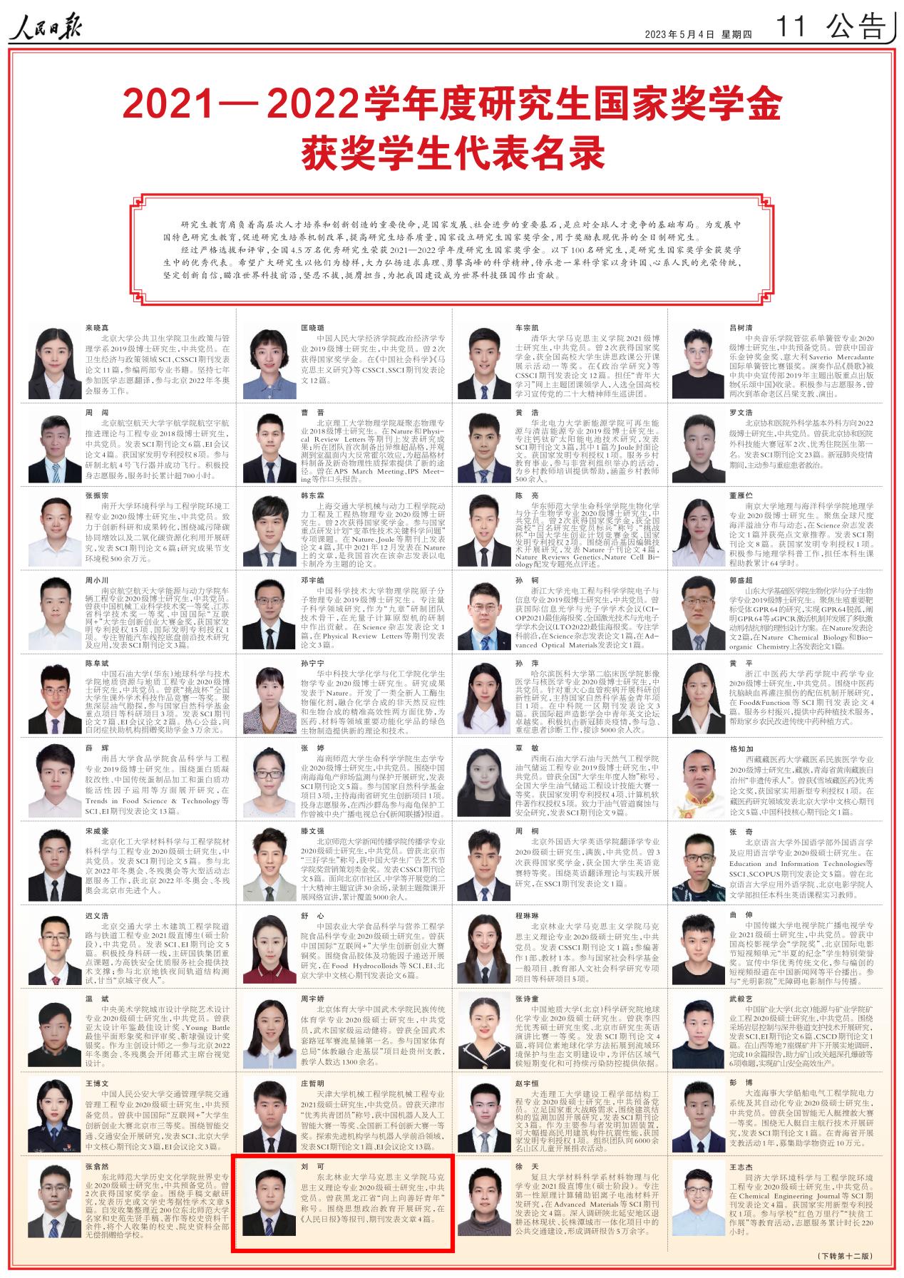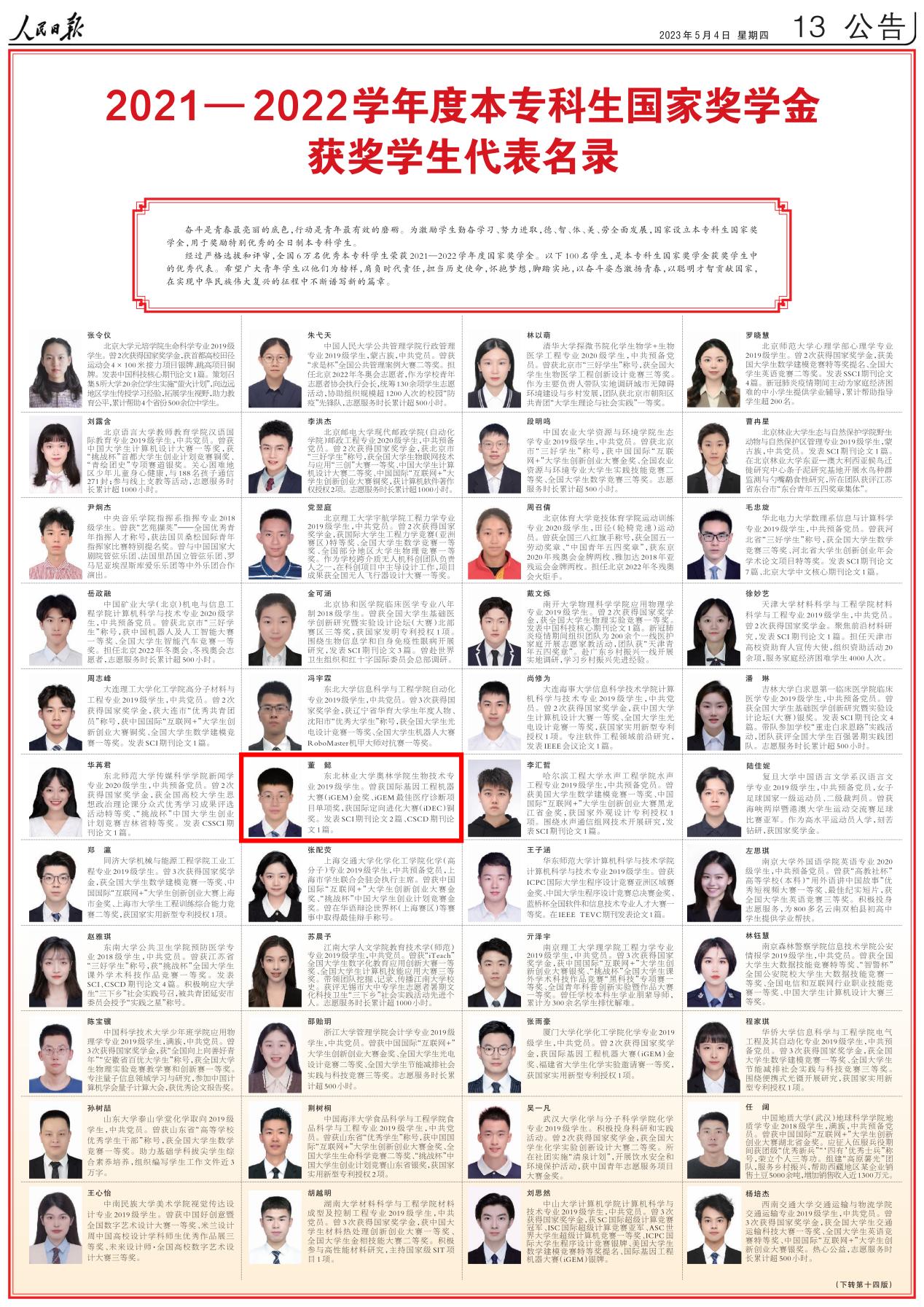 On May 4, the People’s Daily published the 100 student representatives of the National Scholarship for Undergraduates and Junior College Students and the 100 student representatives of the National Scholarship for Postgraduates for the academic year 2021-2022. Dong Yi, a 2019 biotechnology major from Aulin College, and Liu Ke, a 2020 Marxist theory major from the School of Marxism, stood out among them.