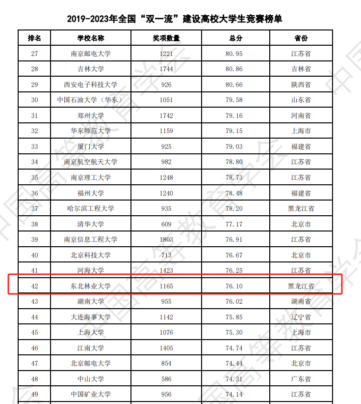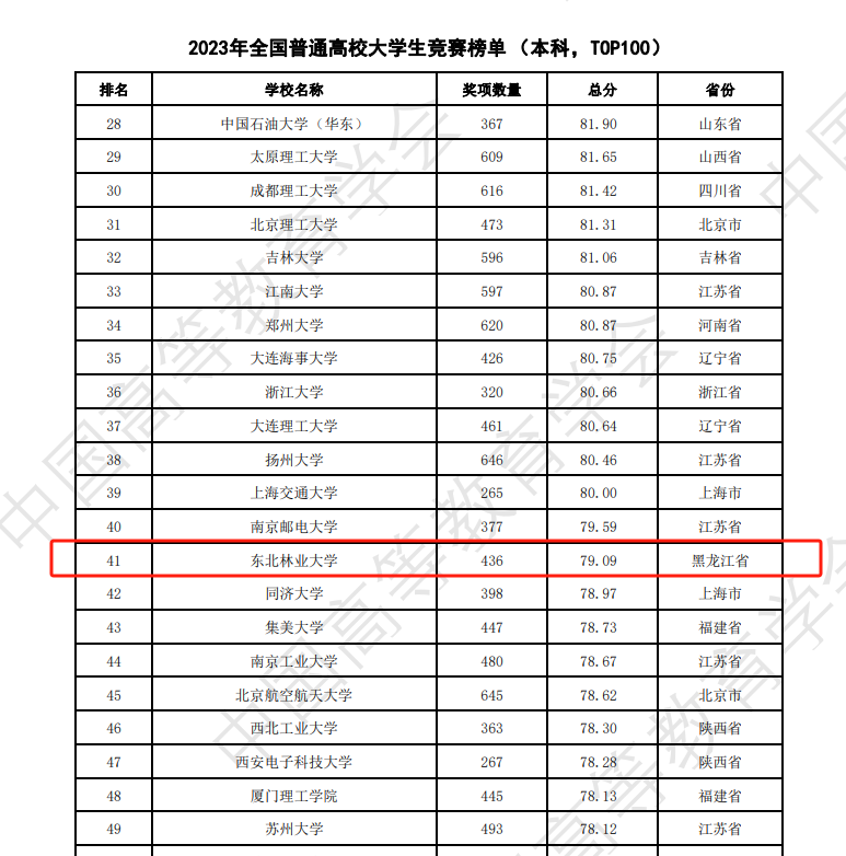 On March 22, the expert group on university competition assessment and management systems from the Chinese Society of Higher Education released the 2023 National College Student Competition Analysis Report. NEFU has once again ranked first in the 2019-2023 National Agricultural and Forestry Category Undergraduate Institutions Student Competition Ranking (TOP 20) with a total score of 76.1, representing 1165 awards. This achievement marks our sixth consecutive year at the top of this list. In addition, NEFU is ranked 41st in the 2023 National General Universities Student Competition Ranking (Undergraduate, TOP 100) and 42nd in the 2019-2023 National 'Double First-Class' University Student Competition Ranking.
