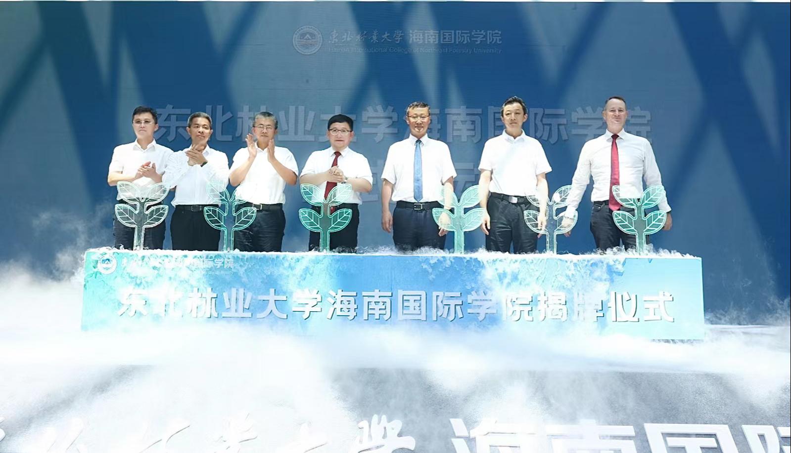Liu Zhaojun, Zhang Zhikun, Song Wenlong, Mo Quanping, Liu Ming, Tang Zhenfu, and Andrew Robertson jointly revealed the Northeast Forestry University Hainan International College plaque.