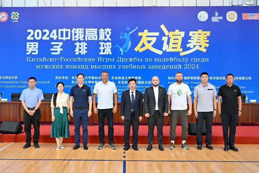 To strengthen friendships through sports, from June 17th to 18th, the Chinese-Russian University Men’s Volleyball Friendship Tournament kicked off at NEFU’s gymnasium. Attending the opening ceremony and watching the games were Liu Shouxin, member of the university’s party committee and vice president; Nokin, vice president of Stavropol State Agrarian University, Russia; Podgorsky, team leader of Belgorod State Agrarian University, Russia; Gursky, team leader of Far Eastern State Agrarian University, Russia; Yang Song, director of the Sports Department of Heilongjiang University; Ma Yibing, vice dean of the School of Physical Education and Training of Harbin Sport University; Li Yuting, general manager of Harbin Leshi Agricultural Technology Co., Ltd. and representative of the Russian Quality System in China; Guan Dapeng, director of the Sports Department of our university; and Wang Bo, dean of the NEFU College of International Exchange.