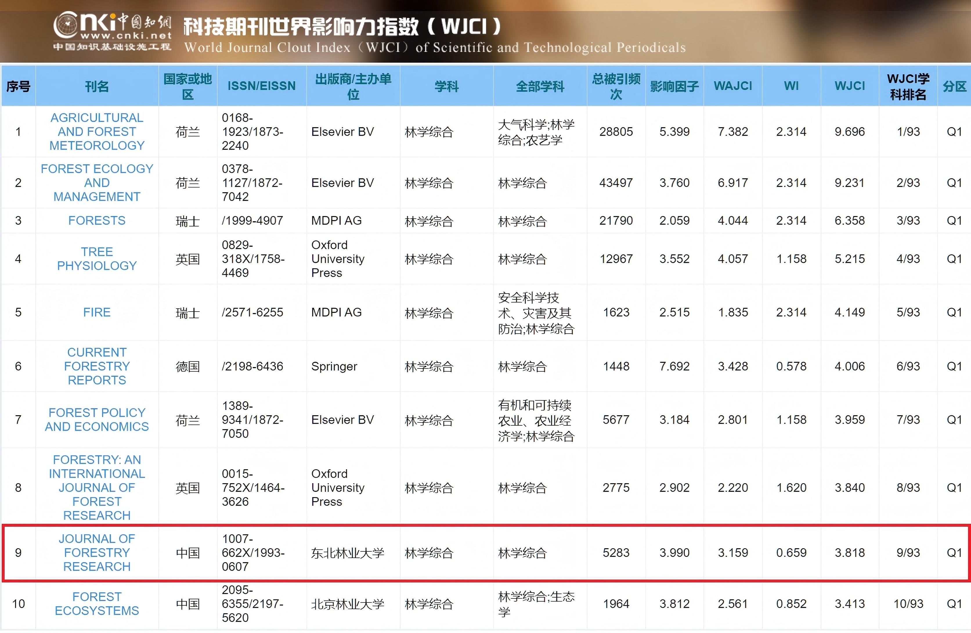 On December 24, the 2024 edition of the World Journal Clout Index (WJCI) Report, jointly developed by the Institute of Scientific and Technical Information of China and other organizations, was officially released. Forestry Research retained its position in the Q1 category, ranking 9th globally among 93 forestry journals. With a total citation frequency (JIA) of 5,283 and a WJCI score of 3.195, the journal also ranked as the top forestry journal in China.