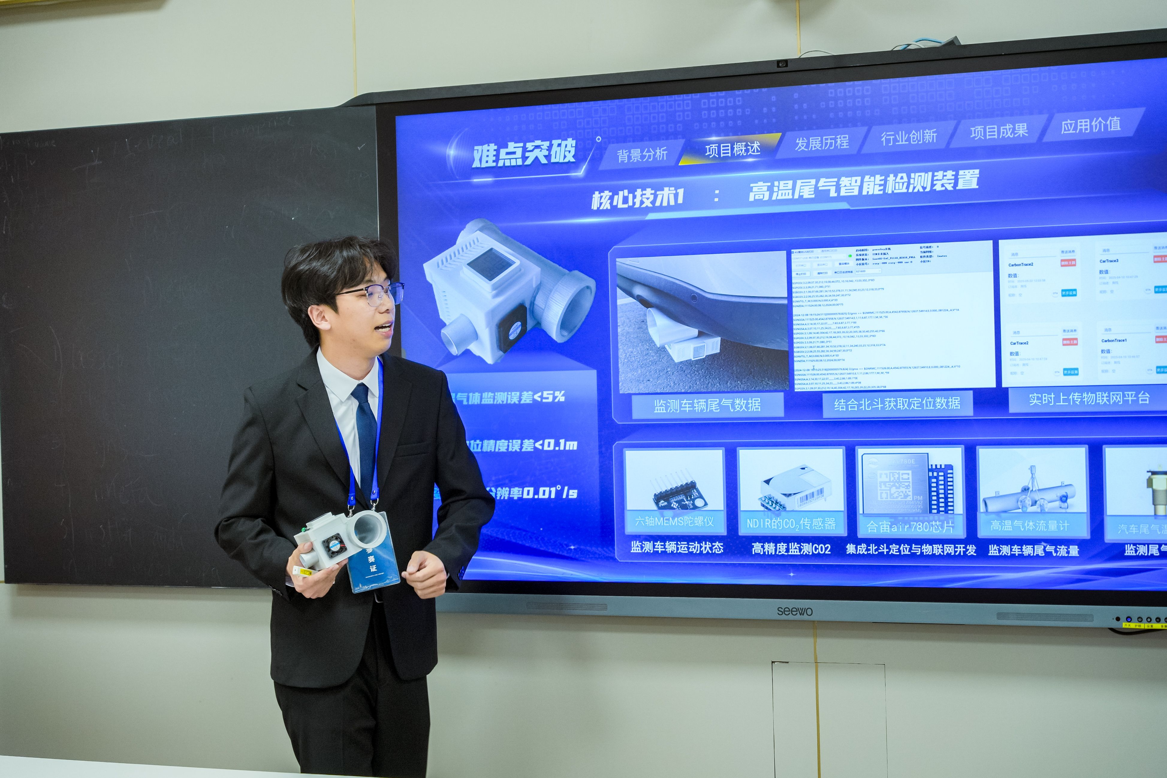 The third-prize-winning project, “Carbon Trace Journey — Multi-Sensing Integrated Onboard Carbon Emission Monitoring and Control System,” developed dynamic carbon emission monitoring equipment. The system collects exhaust gas composition and fuel consumption data in real time through onboard terminals and uses big data analysis technology to provide accurate decision-making support for urban traffic carbon reduction.