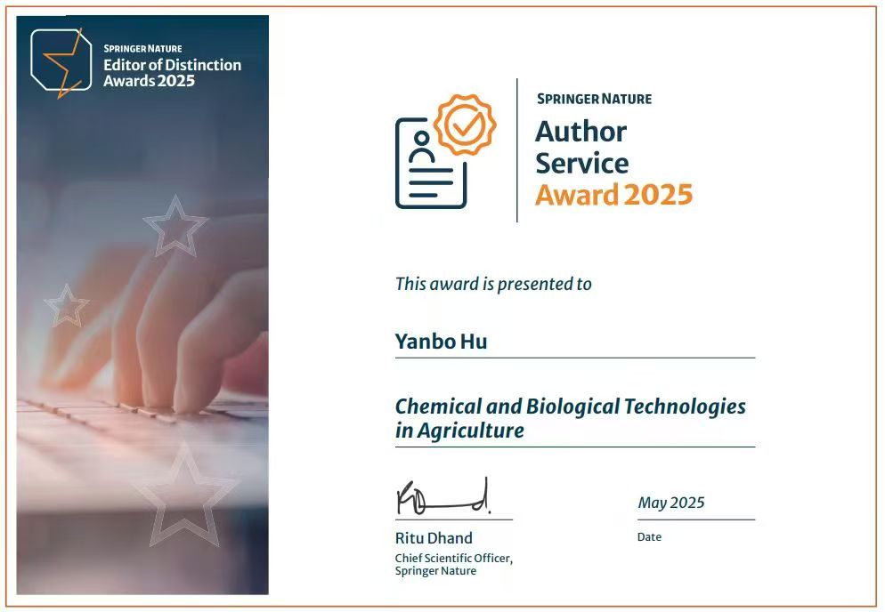 In terms of talent development, the editorial team has seen significant success. Dr. Hu Yanbo joined the editorial board of Chemical and Biological Technologies in Agriculture (CBTA) and received the “2025 Outstanding Editor Award” from Springer Nature. Dr. Sun Jingjue was honored with the “Outstanding Technical Editor” award at the 7th National Science and Technology Journal Young Editors Competition.