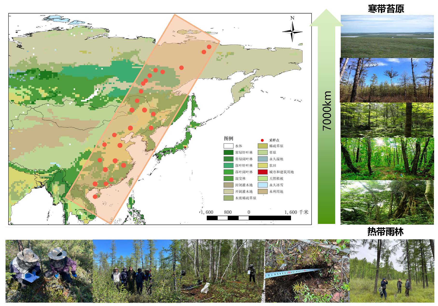 To address these challenges, under the guidance of Academician Yu Guirui, Professor He Nianpeng and his team proposed the concept of the North–South Transect of Eastern Asia (NSTEA) and took the lead in conducting a systematic field investigation. The NSTEA extended approximately 7,000 km, covering all major climatic zones and representative ecosystem types—from tropical rainforests and subtropical evergreen broad-leaved forests to temperate deciduous and mixed forests, boreal coniferous forests, and Arctic tundra. The transect exhibited a typical biodiversity gradient and represented one of the world’s most important carbon sink systems, endowing it with global uniqueness in completeness and representativeness.