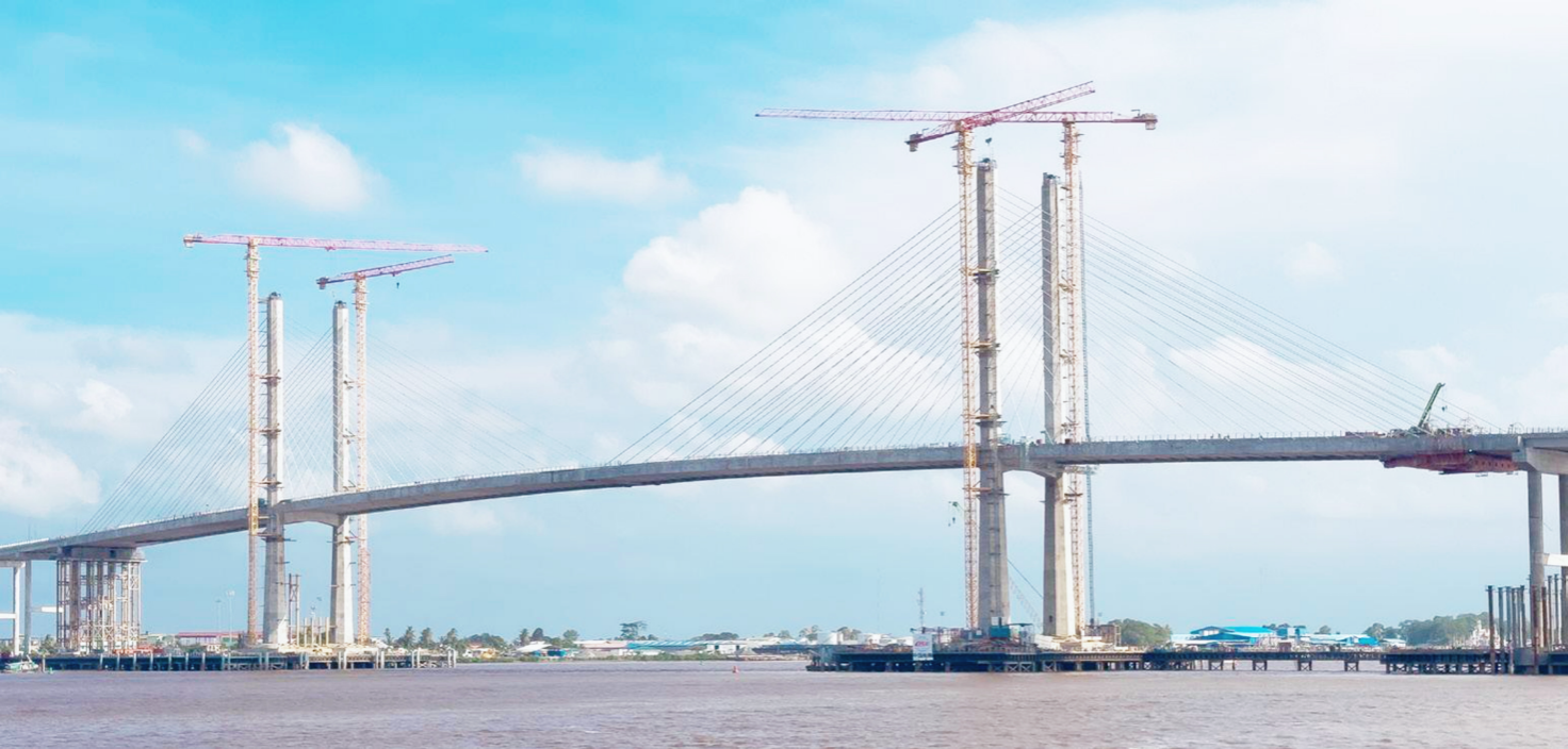 With a total investment of USD 260 million, the New Demerara River Bridge is the largest and most technically complex transportation infrastructure project ever undertaken in Guyana. Spanning the Demerara River at Georgetown, the capital of Guyana, the main bridge adopts a prestressed concrete cable-stayed structure with a span arrangement of (135+300+135) meters, featuring twin towers and double cable planes. The bridge has a total length of 2,800 meters, carrying four lanes of two-way vehicular traffic and two non-motorized lanes, with a design speed of 80 km/h and a service life of 100 years.