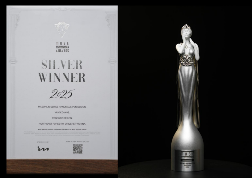 Recently, the winners of the 2025 MUSE Design Awards were announced. Zhang Yang, a faculty member from NEFU’s College of Home and Art Design, won the Silver Award for his handmade pen design, “MASONLIN SERIES HANDMADE PEN DESIGN”. His work stood out among over 3,600 entries from 45 countries worldwide, thanks to its unique design concept and craftsmanship.