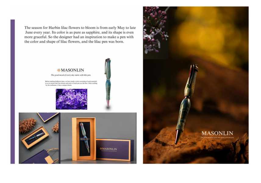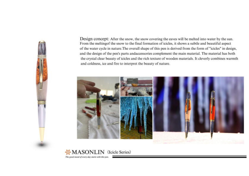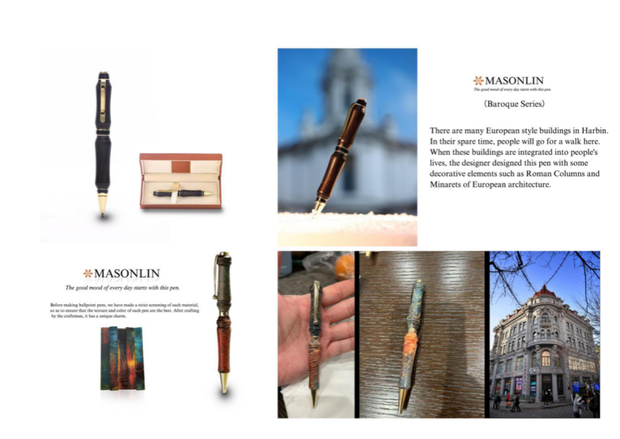 Zhang Yang’s handmade pen series, “MASONLIN,” is a collection of wooden pens meticulously crafted by hand. The design draws inspiration from Harbin's unique regional culture, using the pen’s form and materials to express themes that reflect the city’s ice and snow culture, European architectural features, the beauty of lilacs, and the changing seasons. The concept aims to use the pen as a medium to showcase the city's distinct characteristics and display Harbin’s unique charm.