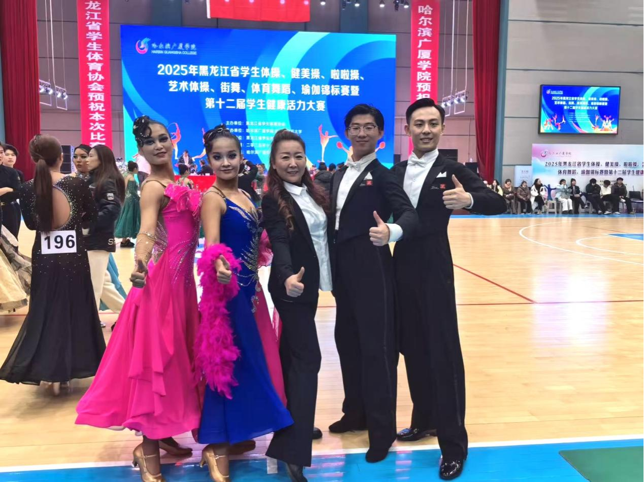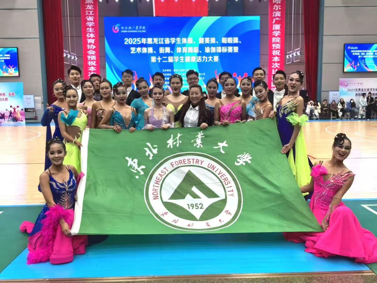 From November 8th to 9th, the 12th Heilongjiang Student Health & Fitness Competition, organized by the Heilongjiang Province Education Department and the Student Physical Education Association, was held at Harbin Guangsha College. Led by Guan Dapeng, the Director of the Department of Physical Education, and coached by Cao Chunyan, the NEFU DanceSport Team performed exceptionally well. With superb technique, elegant style, and a strong competitive spirit, the team emerged as a top performer, winning 13 first-place titles and earning 43 awards in total. Coach Cao Chunyan was also honored with the Excellent Coach Award.
