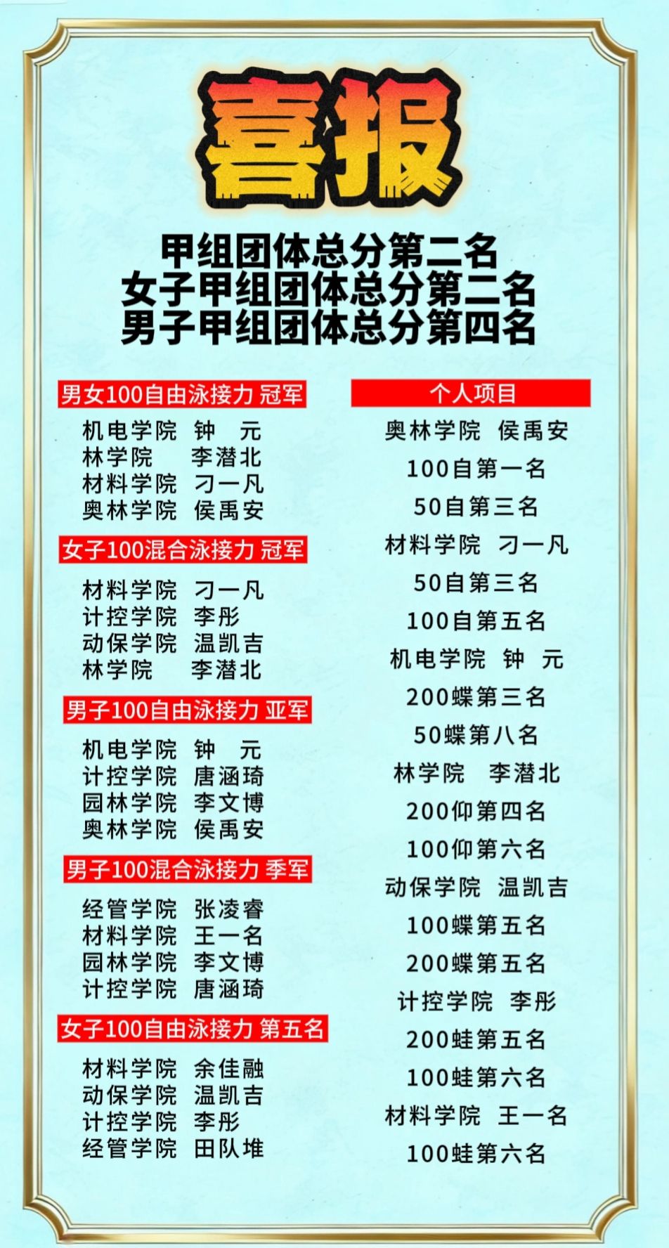 These outstanding achievements are the direct result of the University’s thorough implementation of the “Health First” educational philosophy, its steady advancement of education through sports, and its continued efforts to deepen the integrated talent-cultivation model that combines ideological and political education with physical education. For many years, the NEFU swimming team has adhered to the principle of cultivating virtue through sports, rigorously strengthening training and competitive performance, and leveraging sports to forge character, promote holistic development, and nurture well-rounded talents who excel both athletically and academically.