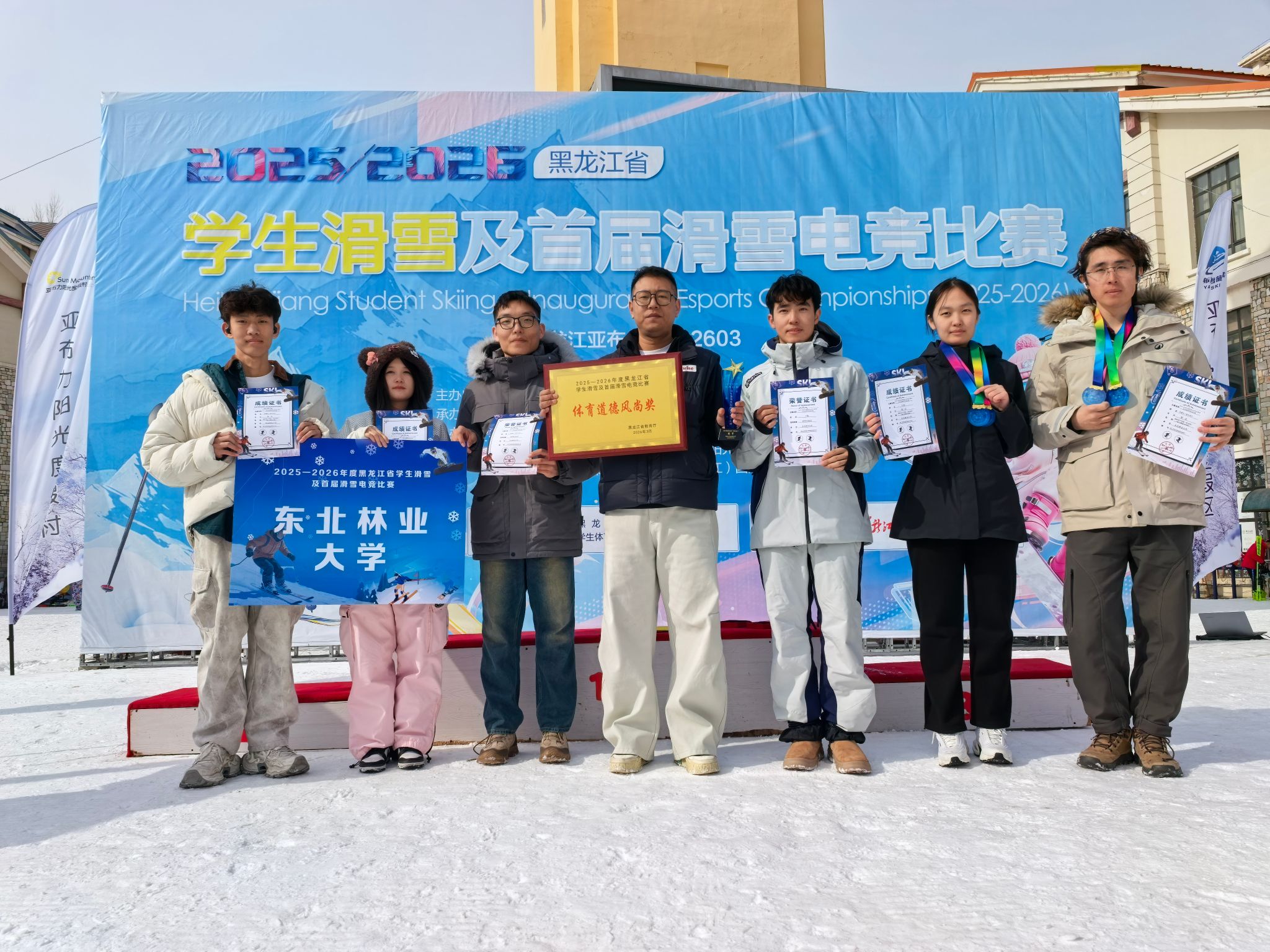 In this high-level, multi-event provincial competition, the ski team from Northeast Forestry University delivered an outstanding overall performance. Demonstrating excellent technique, strong tactical execution, and a resilient competitive spirit, the team secured gold medals in multiple events and achieved impressive results. After intense competition, the NEFU delegation won the Mixed Team Overall Championship (Sunshine Group) and successfully retained the Sportsmanship Award, fully showcasing the team’s comprehensive strength and exemplary sporting spirit.