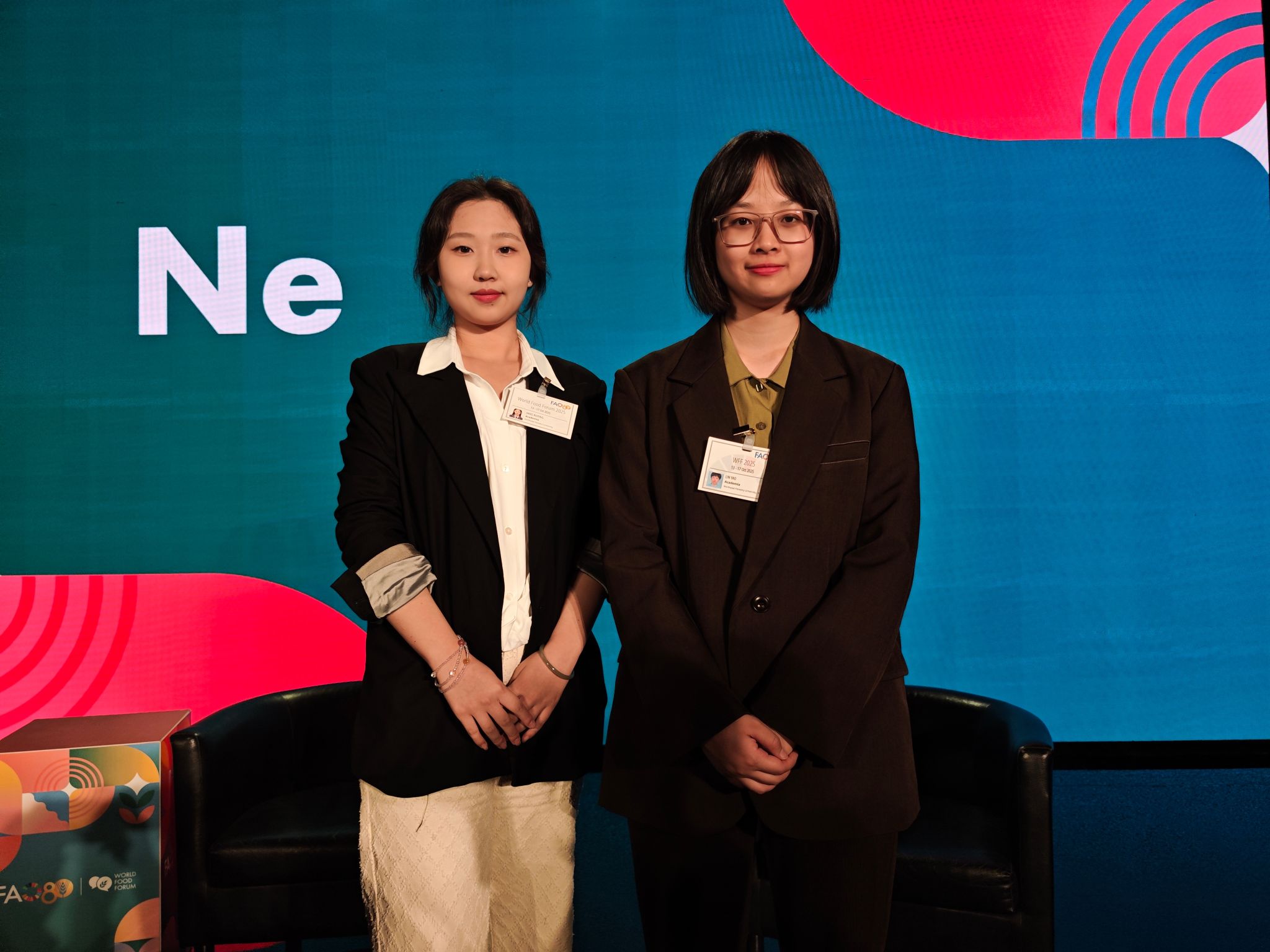 NEFU graduate students Lin Yao (right) and Jiang Ruiying (left) pose for a photo at FAO headquarters during the event.