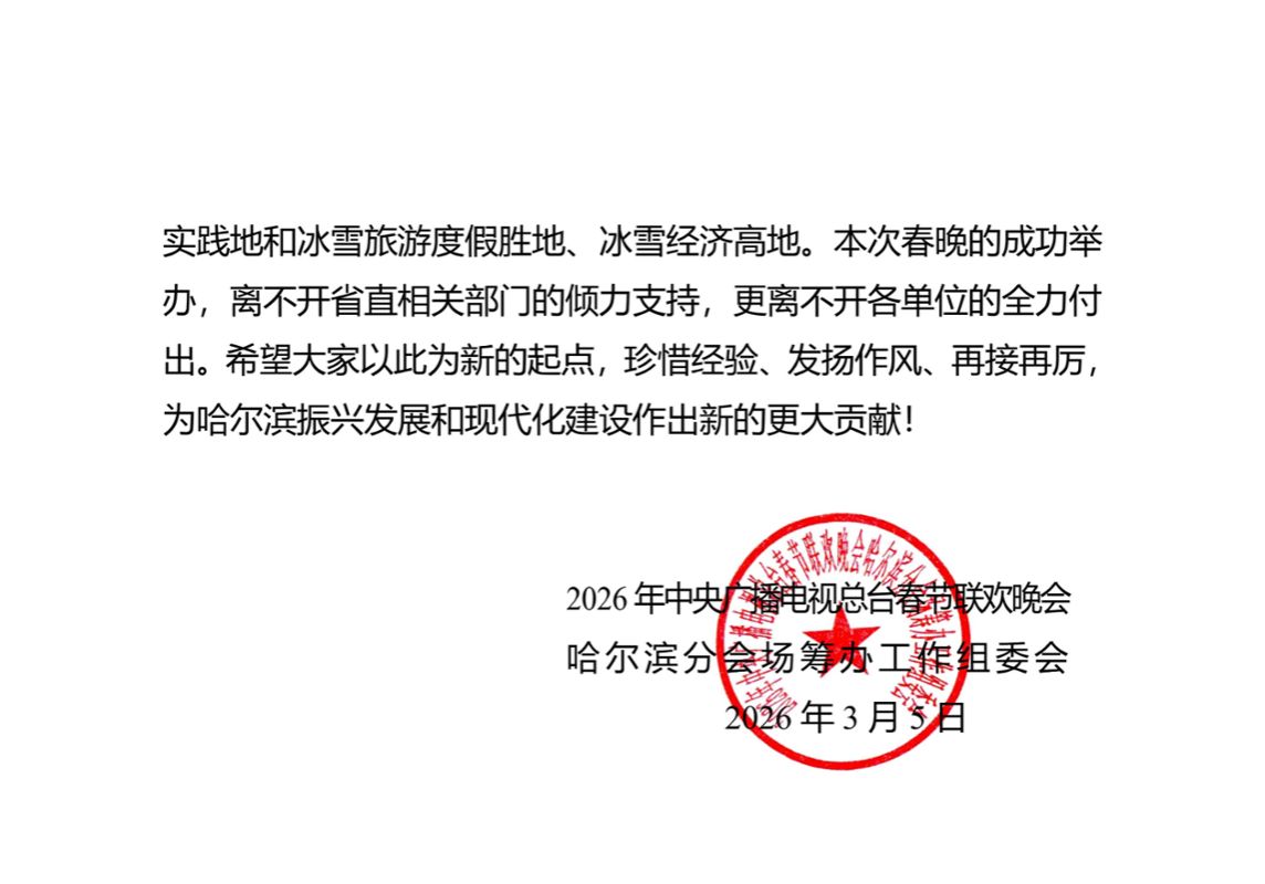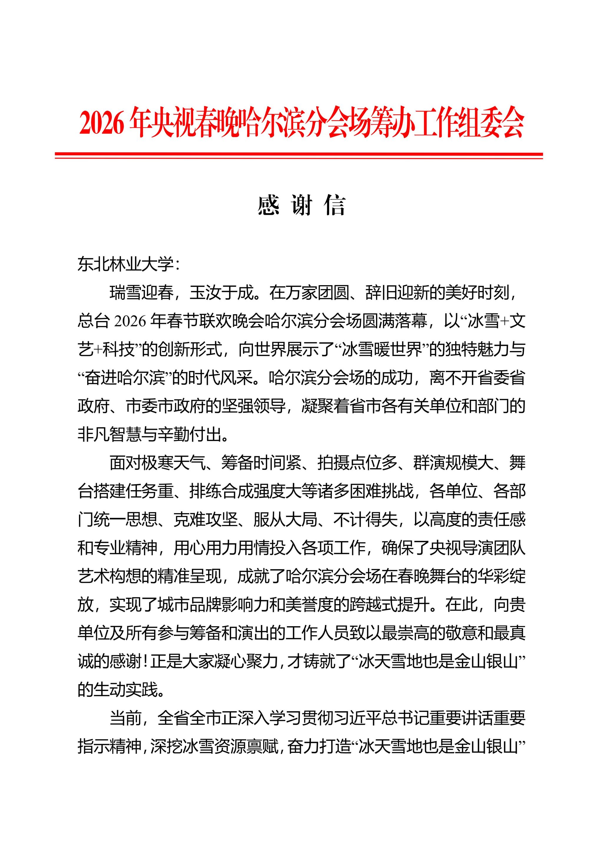 Recently, Northeast Forestry University (NEFU) received a letter of appreciation from the organizing committee for the Harbin sub-venue of the 2026 China Media Group (CMG) Spring Festival Gala. The letter commended NEFU’s international students for their cooperation during the program’s filming and praised their outstanding performance at the event.