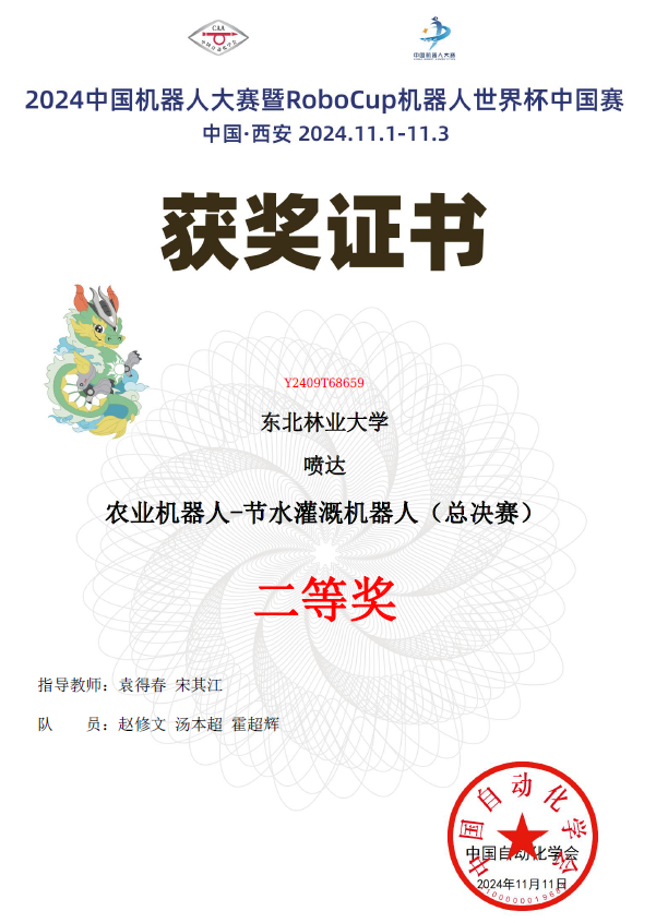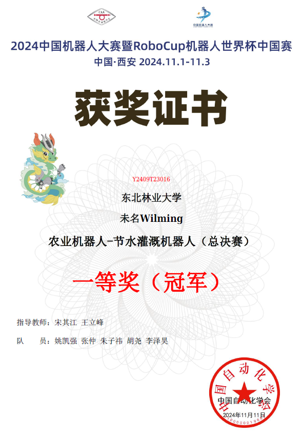 From November 1 to 3, 2024, the China Robotics Competition and RoboCup China Open were held in Xi’an, Shaanxi Province. Two School of Computer and Control Engineering teams at Northeast Forestry University (NEFU) performed outstandingly in the Agricultural Robot Water-Saving Irrigation Project finals. They won the First Prize (Champion) and a Second Prize in this category, marking a historic breakthrough for NEFU.