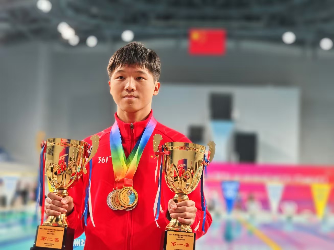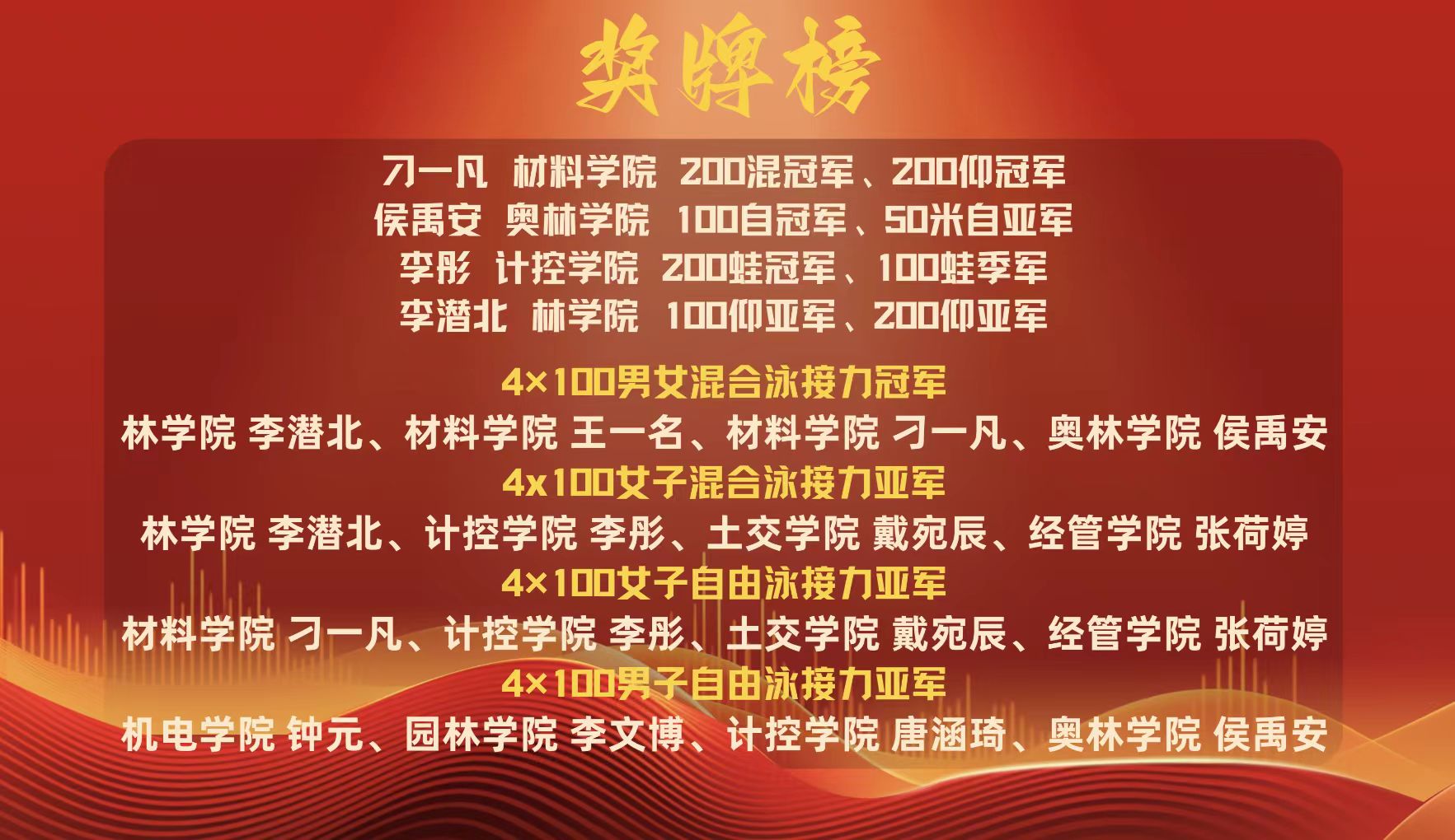Diao Yifan, a 2022 student from the College of Material, claimed victory in the Group A women’s 200m backstroke with a record-breaking time of 2:39.65, securing her place as a top performer. She won a remarkable 3 gold medals and 1 silver medal in the championships. Additionally, Hou Yaan, a 2024 student from Aulin College, participated in a national competition for the first time just two months after enrolling. He displayed impressive determination and skill and won 2 gold and 2 silver medals, embodying the energy and upward spirit of NEFU’s new generation.