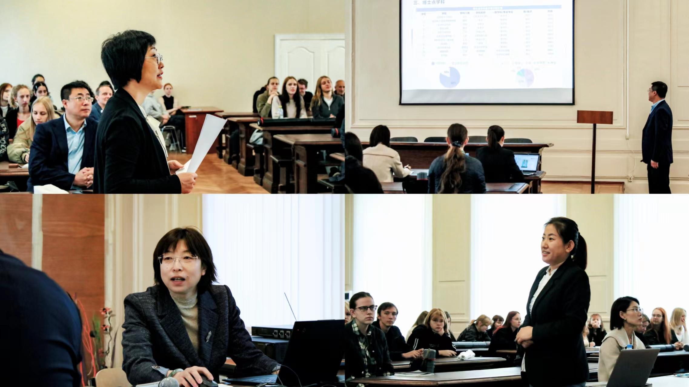 On September 25, a faculty-student meeting was held at SPbSFU, attended by Vice President Alexander Alexandrovich, Dmitry Alexandrovich, Head of the Department of Soil Science, and five other Russian representatives. During the meeting, Wang Jinghong, Dean of NEFU’s School of Landscape Architecture, delivered an academic report titled “Research on the Stress Resistance of Elymus.” Qu Fayi, Vice Dean of NEFU’s Graduate School, and Du Xuejing also gave reports on graduate programs and student training. Ji Xiaoyan, Deputy Director of the International Cooperation Office, answered students’ questions and participated in interactive discussions with Russian students. Li Yuemei, Head of International Student Education Management at NEFU, provided translation throughout the event and promoted NEFU. During the meeting, Wang Jinghong also had in-depth discussions with Alexander Sergeyevich, Dean of SPbSFU’s Faculty of Landscape, Architecture, and Wood Processing, on faculty and student exchanges, as well as short-term project collaborations. Additionally, a student who had participated in a short-term exchange program at NEFU during the winter of 2023 shared their experiences.