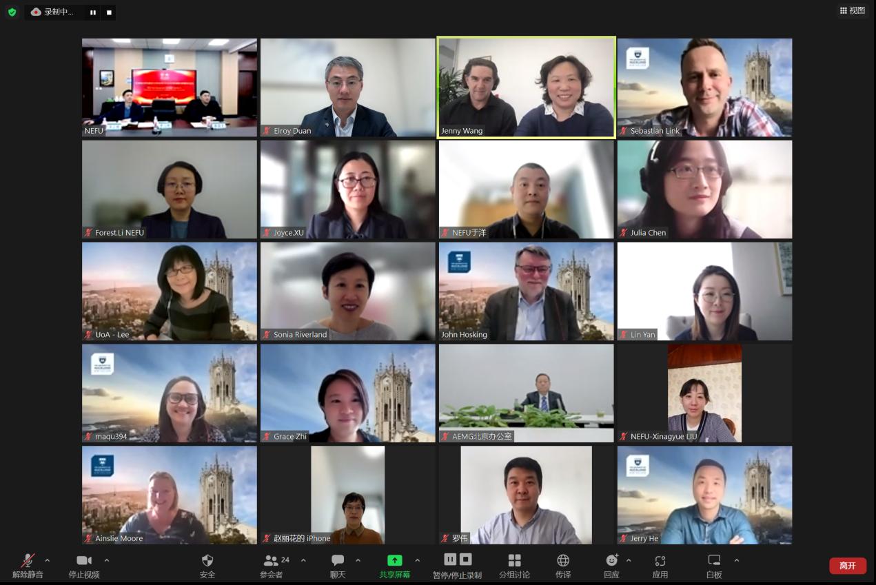 On December 6, the joint management committee meeting between NEFU and UOA (the University of Auckland), was held online in Conference Room 609 of Aulin College. Members of the NEFU Standing Committee, Vice President Zhai Xuefeng, Professor John Hosking, the Dean of Science Department of UOA, and heads of relevant departments from both universities, including Academic Affairs Office and International Cooperation Office, attended the meeting.