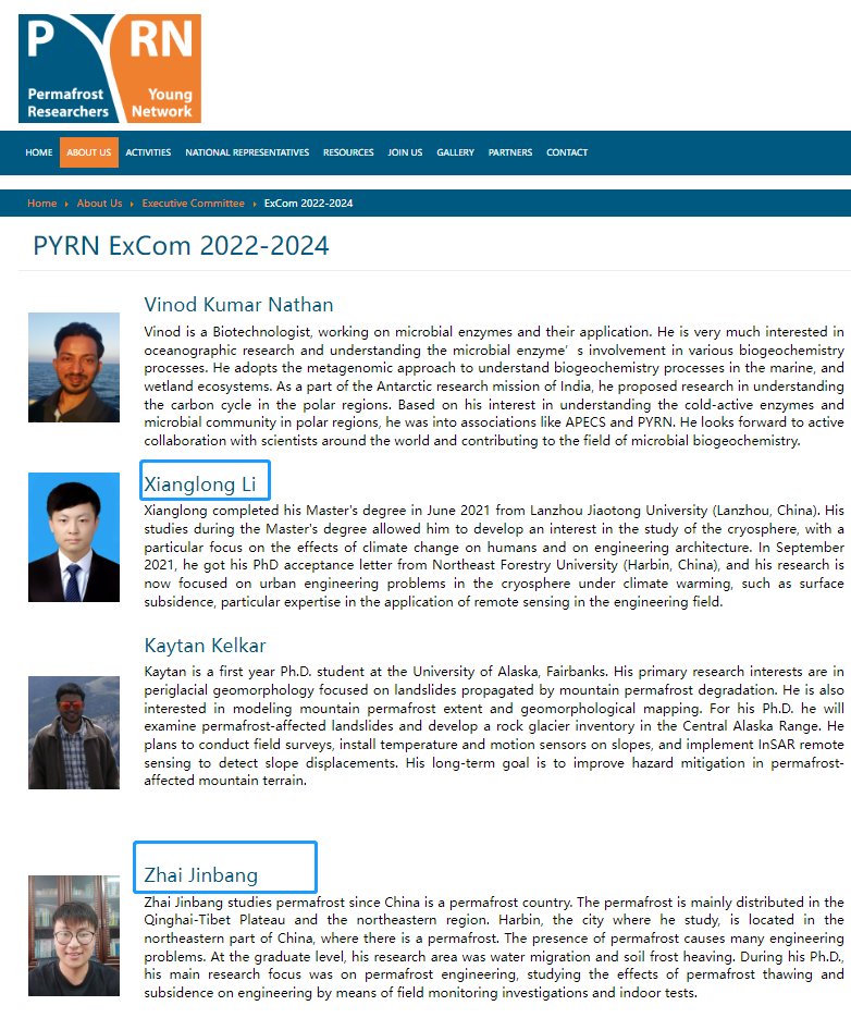 The Permafrost Young Researchers Network (PYRN) has elected Zhai Jinbang, a 2020 PhD student in Transportation Engineering in the School of Transportation, and Li Xianglong, a 2021 PhD student in Forestry Engineering in the School of Civil Engineering, as executive members of the PYRN for the period 2022-2024. There are seven executive members for the 2022-2024 term from China (two from Northeast Forestry University), the United States (one from the University of Alaska, one from Stockholm University and one from Northern Arizona University), Russia (one from Lomonosov Moscow State University) and India (one from Sastra University). The network meeting was organised by Adam Kirkwood, Chair of the 2020-2022 Executive team from Laurentian University, Canada.