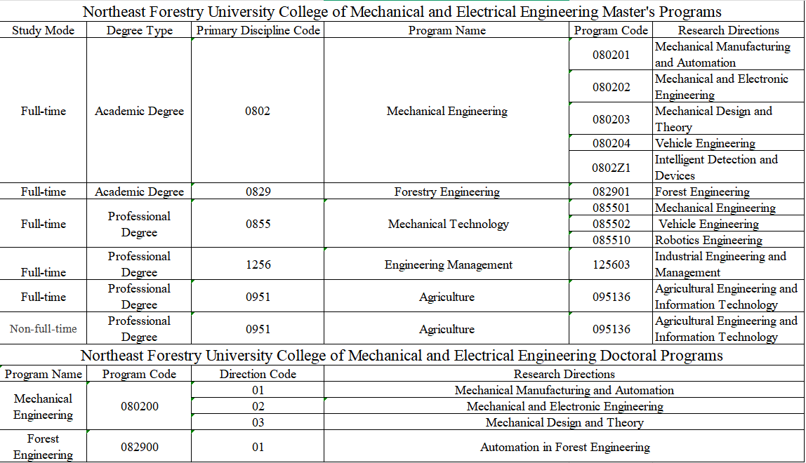 The College of Mechanical and Electrical Engineering holds a first-level doctoral degree authorization in Mechanical Engineering, has established a postdoctoral research mobile station, and is recognized as a Heilongjiang Provincial Key Discipline. It offers six doctoral research directions: Mechanical Design and Theory, Mechanical Manufacturing and Automation, Mechatronic Engineering, Vehicle Engineering, the self-established direction of Intelligent Detection and Devices, and Forest Engineering (under Forestry Engineering). The college has a first-level master's degree authorization in Mechanical Engineering with five disciplinary directions: Mechanical Design and Theory, Mechanical Manufacturing and Automation, Mechatronic Engineering, Vehicle Engineering, and Forest Engineering (under Forestry Engineering). It grants professional degrees in the Mechanical category, encompassing five fields: Mechanical Engineering, Vehicle Engineering, Robotics Engineering, Agricultural Engineering, Information Technology, and Industrial Engineering Management.